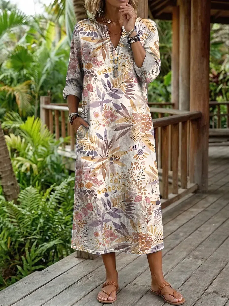 2026 Bavlněné lněné šaty s výstřihem do V