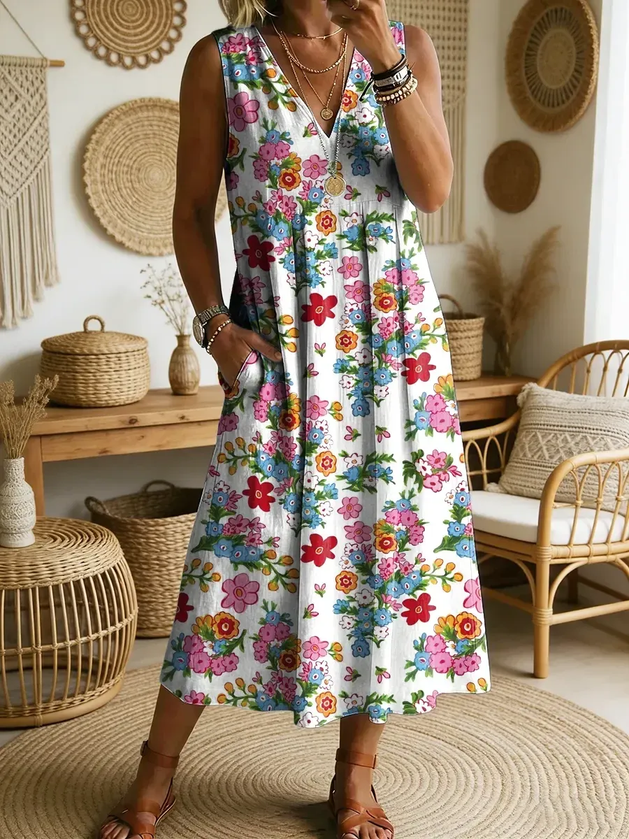 2026 Bavlněné lněné šaty s výstřihem do V