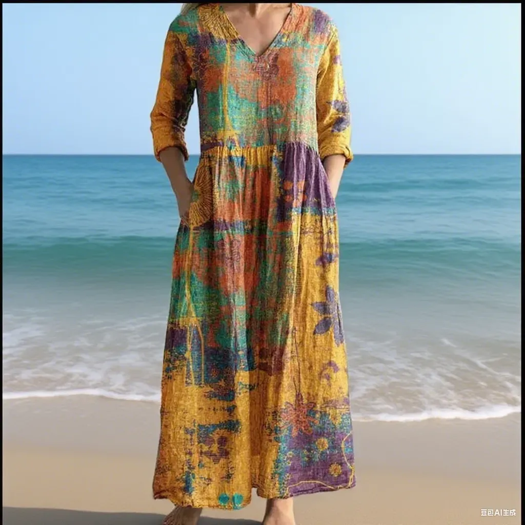 2026 Bavlněné lněné šaty s výstřihem do V a kapsami