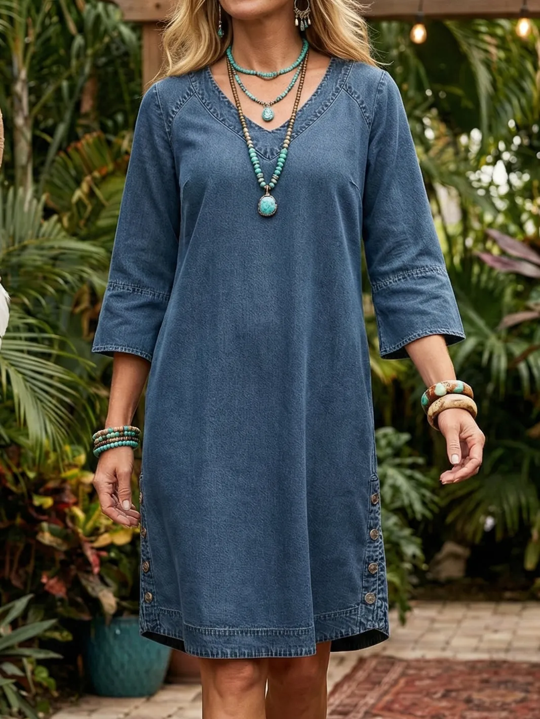 Tyto šaty z kombinace bavlny a lnu byly navrženy s důrazem na pohodlí, jednoduchost a přirozenou ženskost. Výstřih do V krásně prodlužuje siluetu a dodává šatům jemně elegantní vzhled, ve kterém se budete cítit sebevědomě po celý den.