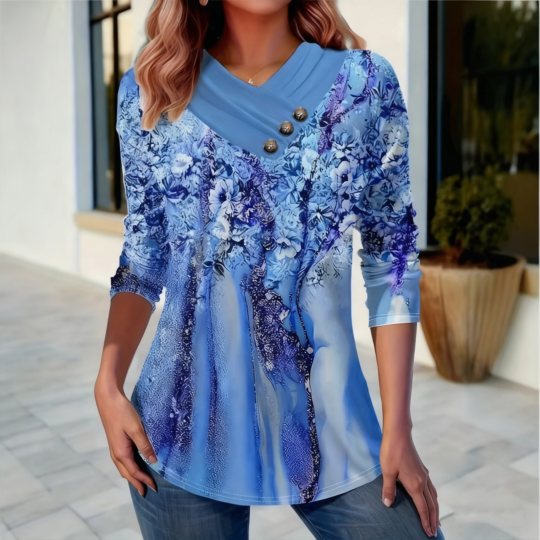 Květinový potisk nikdy nevyjde z módy! Jemné květy dodávají tomuto tričku elegantní a svěží vzhled, který podtrhne vaši přirozenou krásu. Ideální volba pro ženy, které milují jemný a romantický styl.